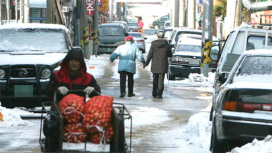 지난 27일 내린 폭설로 대로변의 눈은 제설작업이 되었지만 골목길은 아직도 빙판되어 시민들의 통행을 위협하고 있다. 29일 전주 서서학동 골목길에 노인들이 서로 손을 잡고 빙판길을 걷고 있다.