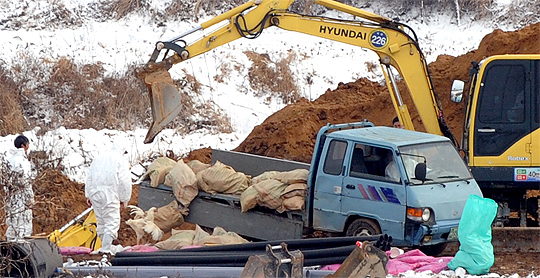 지난 30일 익산시 망성면 양계농가에서 AI감염 의심 닭을 포크레인으로 살처분 작업 하고 있다.
