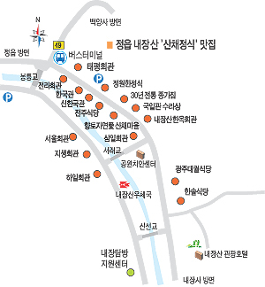 전주에서 1번 국도를 타고 정읍시내를 지나 내장사에 들어갈 즘, 현대식 간판으로 새옷을 입은 음식점들이 모여 있다. 20~30년 넘게 그 자리를 지키는 산채정식 음식점들이다. 최근 정읍은 사계절 관광도시로 탈바꿈 하고 있으며 관광개발이 꾸준히 진행중이다. 이곳 음식점들은 지난해 현대화 사업 일환으로 정읍시로부터 지원을 받아 낡고 오래된 간판을 새롭게 정비해 봄 손님을 맞이하고 있다.