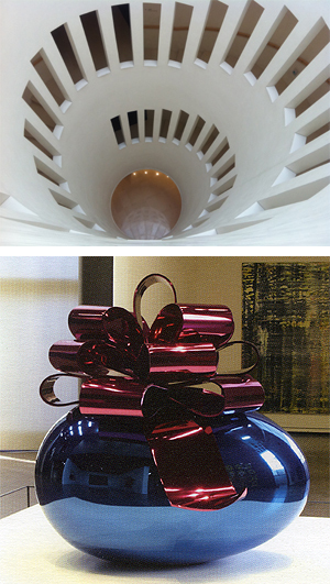 리움미술관의 고미술 전시장 뮤지엄1의 계단은 한국 도자기의 부드러운 곡선모양을 형상화했다.(사진 위), 현대미술관 뮤지엄2에 전시되고 있는 제프 쿤스 작품 '리본을 묶은 매끄러운 달걀'. (desk@jjan.kr)