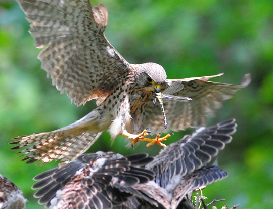 어미는 새끼들에게 잠자리를 물리고 있다. 황조롱이는 들쥐 다람쥐 등 육식을 한다. 어미는 다 자란 황조롱이 새끼들에게 독립심을 길러주기 위해 한동안 돌아오지 않기도 하고, 잘 날 수 있도록 체중 조절도 시킨다. 새끼를 기르는 모성애는 사람과 다르지 않다.