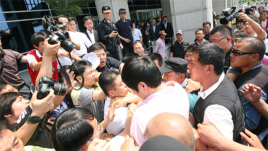 전북도가 전북고속에 보조금을 지급한 것과 관련하여 28일 도청 브리핑룸에서 민주노총 전북본부와 버스파업 해결과 완전공영제 실현 전북지역시민사회단체 대책위의 기자회견이 예정되어있었으나 경찰 및 공무원들이 출입문을 봉쇄하자 버스 노조원과 몸싸움을 하고 있다.