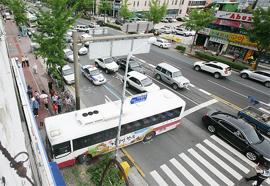 지난 30일 전주시 덕진광장 앞 사거리에서 시외버스가 인도로 돌진해 가로수를 들이받고 상가앞에서 멈춰 서있다. 다행히 인명피해는 없었으나 교통이 1시간째 지.정체 현상을 빚었다.