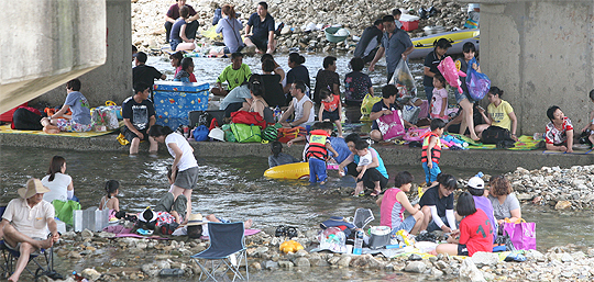 전주를 비롯한 도내 6개 시·군에 폭염주의보가 발효된 17일 전주 색장동 안적교 아래에서 시민들이 더위를 피하고 있다.