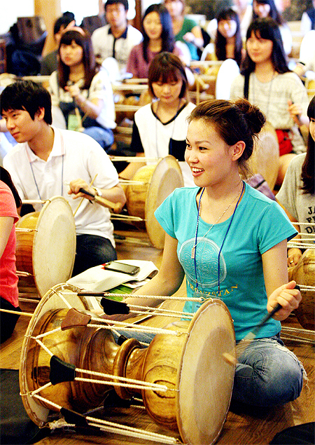 18일 전주 한옥마을을 방문한 동아대학교 유학생들이 전통문화관에서 장구를 치며 전통문화체험을 하고 있다.
