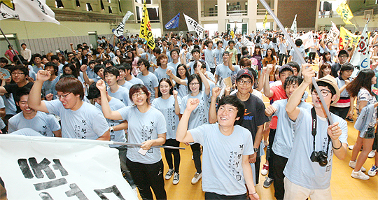 18일 전북대학교 체육관에서 열린 전북대 하계 농촌봉사활동 발대식에 학생들이 화이팅을 외치고있다. 이번 농촌봉사활동에 참여하는 대학생은 1412명으로 역대 최대 인원이며 학생들은 농가들의 수해 복구와 하절기 일손돕기에 나선다.