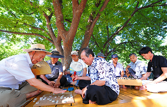 20일 오후 전북 지역에 폭염주의보가 내려진 가운데 따가운 햇볕을 피해 전주 덕진공원 나무 그늘에 모인 어르신들이 장기와 바둑을 두고 있다.