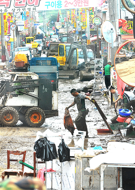 지난9일 기상관측 이래 1일 강수량 최고치인 420mm를 기록한 정읍지역의 폭우로 전역이 침수피해를 입은 가운데 10일 정읍 산외면 한우마을의 상가 전체가 물에 잠겨 주민들과 군부대가 중장비를 이용하여 복구작업을 하고 있다. 추성수(chss78@jjan.kr)