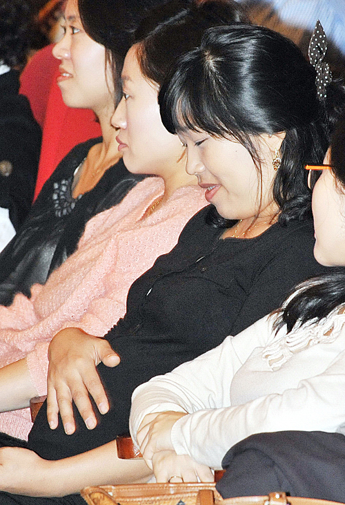 10월10일 임산부의 날을 맞아 전주 덕진예술회관에서 열린 제12회 모아사랑 태교음악회에 참석한 한 임산부가 배를 스다듬으며 행복한 미소를 짓고 있다.