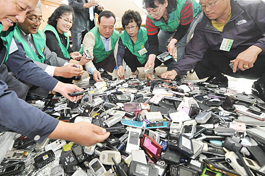 전주시 새마을회는 11일 전주 인후동 새마을 사무실에서 최근 스마트폰 등 첨단 기능제품 출시로 가정이나 사무실 서랍 속에 방치되고 있는 폐 휴대폰 2,000여 개를 모아 분류하고 있다. 도심 광산이라 불리는 폐 휴대폰 1t을 분해하면 금400g, 은3kg, 구리100kg, 니켈 16kg을 추출할 수 있으며 이날 모인 2,000여개의 핸드폰은 연말 어려운 이웃들을 위한 김장김치 마련 기금으로 활용될 예정이다.