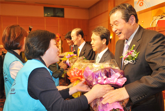 12일 전주리베라호텔에서 열린 전북재향군인회 제14차 국민화합 (전북-경북) 친선교류행사에 회원들이 경북 회원들에게 환영의 꽃다발을 전달하고있다