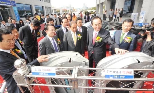 2일 전북도청에서 개막한 제6회 국제탄소페스티벌에서 김완주도지사를 비롯한 초청인사들이 일반 자동차 도어 무게보다 10kg 이상 가벼운 탄소복합제로 만들어진 제품을 만져보고 있다.