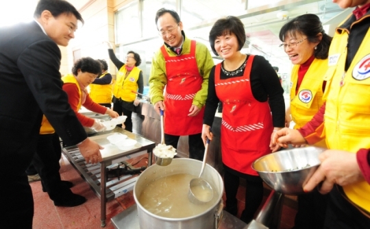 전주노송천문화공동체(회장 정명례)와 대한적십자사 전북도지사 자원봉사자들은 11일 전주 초등학교 급식실에서 설명절 맞이 떡국나눔 행사를 갖고 어르신들께 전달할 400인분 떡국을 만들고 있다. … 노송천문화공동체 정명례 회장은 지난 동지 팥죽 나눔행사에 이어 새해를 맞이 하여 이웃간의 정을 나누고 따듯한 마음을 나누고자 사랑의 떡국 나눔 행사를 가지게 되었다며 앞으로도 봉사활동을 통해 더불어 함께하는 지역사회를 만들기 위해 노력하겠다"고 말했다.