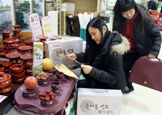 설을 앞두고 13일 서울 중구 봉래동 롯데마트 서울역점에 휴대용 제기세트가 등장해 고객들의 눈길을 끌고 있다. 성묘 때 유용한 휴대용 제기세트는 향로, 돗자리, 술잔, 제기 등으로 구성돼 있으며 야외에서 일회용품 필요없이 격식있게 제사상을 준비할 수 있다. 가격은 2만3000원. 연합뉴스