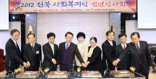 13일 전주 아름다운컨벤션웨딩홀에서 열린 2012 에 김완주도지사를 비롯한 참석인사들이 축하떡을 자르고 있다. 사진 제공=전북도