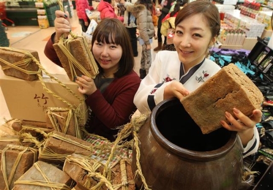 29일 오전 서울 중구 롯데마트 서울역점에서 메주, 천일염 등이 포함된 장 만들기 세트가 판매돼 눈길을 끌고 있다. 100% 국내산 재료를 사용한 세트에는 메주, 천일염, 참숯, 건고추 등이 포함돼 추가 재료 구매없이 장 담그기가 가능하다. 연합뉴스