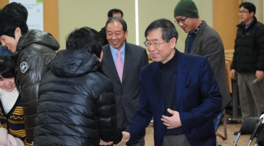 휴가중인 박원순 서울시장이 27일 완주군 안덕파워빌리지를 찾은 가운데 마을 만들기와 청년 취업 등 주민들과의 열린 대화에 앞서 임정엽 군수와 함께 주민들과 악수를 나누고 있다.