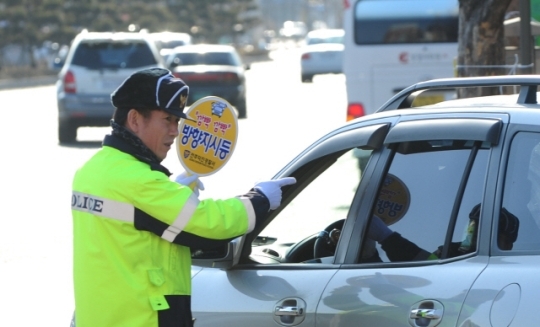 30일 전주 종합경기장사거리에서 교통경찰이 원활한 차량 흐름을 방해하는 방향지시등 계도 단속을 하고 있다. 전북경찰청은 이번주까지 방향지시등 홍보활동과 계도기간을 갖고 다음달 8일부터 집중단속을 실시할 계획이다.