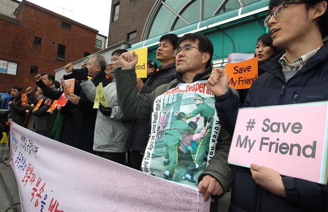 바른사회대학생연합과 바른사회시민회의 주최로 4일 서울 종로구 주한중국대사관 건너편에서 열린 탈북자 북송중단 촉구 기자회견에서 참석자들이 북송중단 구호를 외치고 있다. 연합뉴스