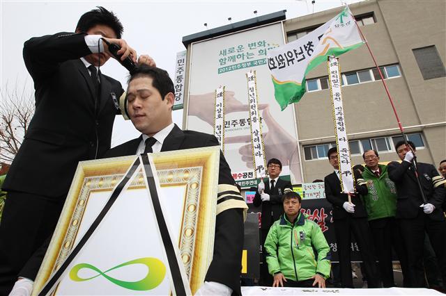 민주통합당이 4·11 총선 공천 후유증으로 진통을 겪고 있는 가운데 4일 서울 영등포당사에서 열린 '불공평 공천 항의집회'에서 옛 민주당 청년위원회 한 관계자가 삭발을 하고 있다. 연합뉴스