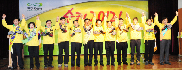 26일 민주통합당 전북도당 대회의실에서 열린 '4·11 총선 필승 선거대책위원회 발대식에서 박지원 최고위원와 후보들이 열심히 뛰겠다는 의미로 등산화를 목에 걸고 총선 승리 결의를 다지고 있다.