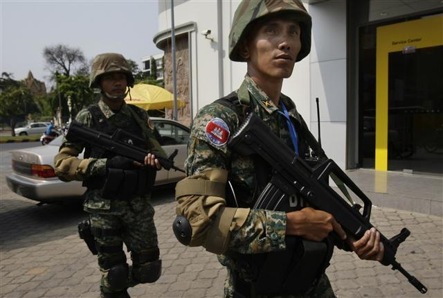 동남아국가연합(아세안) 정상회의가 열릴 예정인 캄보디아의 프놈펜에서 28일(현지시간) 군경들이 회의장으로 쓰일 캄보디아 평화궁전 주위를 돌며 안전확보에 만전을 기하고 있다.
