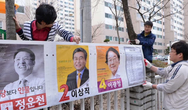 4·11 총선 공식 선거운동이 시작된 29일 오후 전주 완산구 삼천동에서 주민센터 직원들이 전주 완산을 선거구 후보들의 선거벽보를 거리에 부착하고 있다.