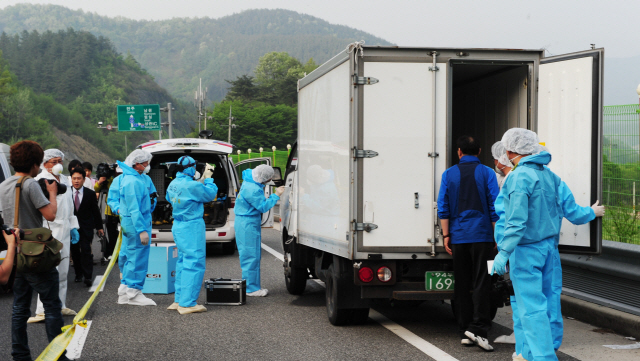 ▲ 3일 완주군 상관면 신리 21번 국도 고덕터널 인근 갓길에 주차된 냉동트럭에서 10여째 행방불명됐던 전주 모 예식장 전 대표 고모씨 등 3명이 숨진 채 발견돼 과학수사대가 감식을 하고 있다. 추성수기자 chss78@
