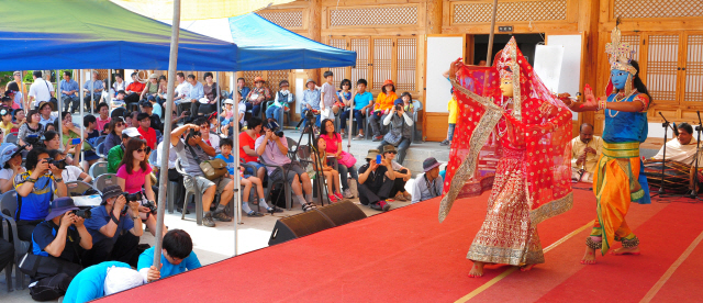 신들의 춤은 충분히 신비롭고 매혹적이었다. 3일 오후 2시30분 전주 부채문화관에서 선보인 인도의 차우댄스. 평범한 여성 라다와 신 크리쉬나의 사랑을 표현한 라다크리쉬나는 '2012 전주 아시아·태평양무형문화유산축제'를 방문한 시민들에게 잊지 못할 추억을 선물했다. ▶ 관련기사 14면