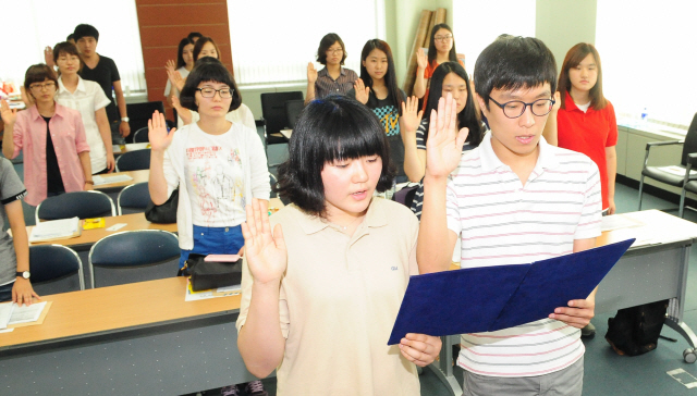 10일 전주 현대해상 회의실에서 열린 다문화 자녀를 위한 대학생 자원봉사자 오리엔테이션에서 자원봉사자들이 멘토 서약을 하고 있다.