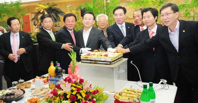 10일 전북 도의회에서 열린 제9대 개원 2주년 기념식에서 김완주도지사와 최진호 도의장, 김승환 교육감등 참석자들이 축하떡을 자르고 있다.