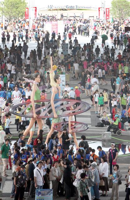 2012 여수세계박람회 폐막을 한 달 앞두고 주말 11만명, 평일 9만 명에 가까운 인파가 몰리는 가운데 12일 오후 엑스포디지털갤러리(EDG)에 많은 인파가 몰려 거리문화공연을 즐기고 있다. 연합뉴스