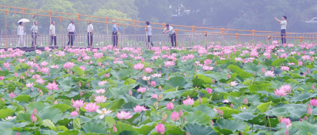 장마전선이 소강상태를 보인 12일 전주 덕진공원에 많은 시민들이 활짝 핀 연꽃을 보며 산책을 하고 있다.