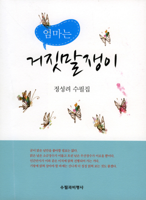 수필가 정성려씨가 첫 수필집'엄마는 거짓말쟁이'를 냈다(수필과 비평사). 중풍과 치매로 고생하신 시어머니 봉양으로 효부상을 받기도 한 그의 수필집에는 부모를 그리워 하는 글들이 많이 눈에 띈다.