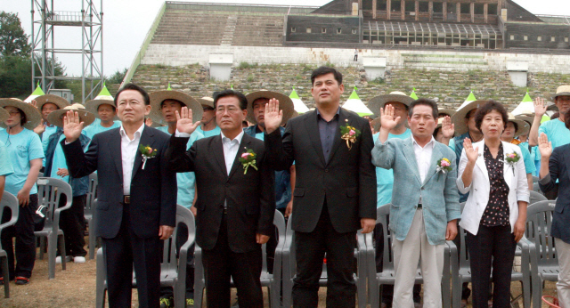 지난 10일 무주 덕유산리조트내 점핑파크장에서 열린 에 김완주도지사· 홍낙표 무주군수, 박민수 국회의원, 송영선 진안군수 등이 참석한 가운데 선서를 하고 있다.〈관련기사 7면〉 사진제공=전북도