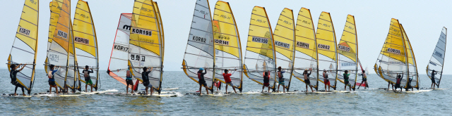 '제7회 전국 해양스포츠제전'이 부안 격포항과 고사포에서 10일 개막한 가운데, 11일 격포항에서 윈드서핑 경기에 참가한 각 시·도 선수들이 힘차게 물살을 가르며 레이스를 펼치고 있다.