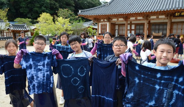 완주교육지원청의 한자문화캠프가 13일 전주전통문화연수원에서 열린 가운데 캠프에 참가한 완주군 학생들이 천연염색 체험을 하고 솜씨를 자랑 하고 있다. ········
