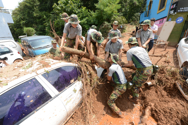 지난 13일 군산지역에 400mm 넘는 기록적인 집중폭우로 쏟아져 피해가 속출하고 있는 가운데 14일 군산 산북동에서 35사단 장병들이 산사태로 쓸려내려온 토사를 구슬땀을 흘리며 치우고 있다.
