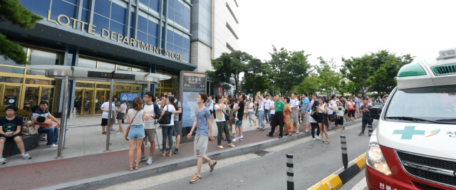 15일 오후 전주 서신동 롯데백화점 전주점 8층 롯데시네마에 화재가 발생, 쇼핑을 나온 많은 시민들이 밖으로 나와 건물사이로 뿜어져 나오는 연기를 바라보고 있다.
