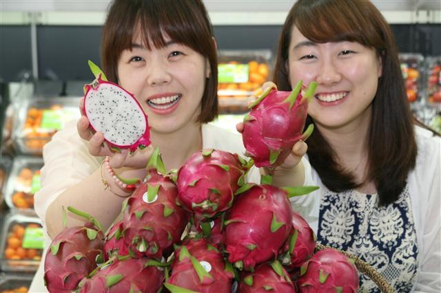농협하나로마트에서는 15일 제주도에서 출하된 '용과'를 선보였다. 용과는 선인장 열매의 하나로 칼륨 함량이 사과나 배보다 월등히 높고 마그네슘 등 인체에 유익한 미네랄 성분과 항산화 물질을 풍부하게 함유하고 있어 건강 과일로 인기가 높다. 연합뉴스