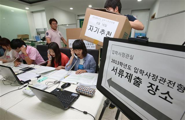 2013학년도 대입 수시모집 원서접수가 시작된 16일 서울 광진구 화양동 건국대학교 입학사정관전형 서류제출처에서 관계자들이 분주히 움직이고 있다. 연합뉴스