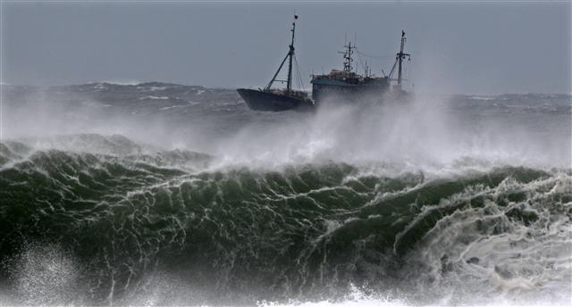 ▲ 위기의 어선…27일 제15호 태풍 '볼라벤'의 영향으로 제주도 전해상에 태풍경보가 발효된 가운데 서귀포시 안덕면 대평리 앞 해상으로 대피한 중국어선이 높은 파도를 맞아 필사적으로 버티고 있다. 제주=연합뉴스