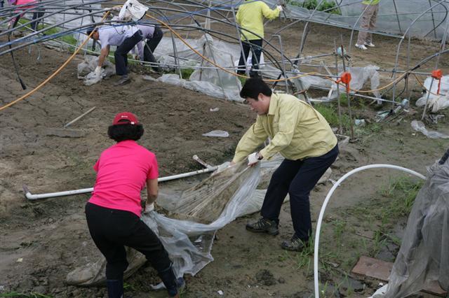 익산시자원봉사종합센터(이사장 엄양섭) 소속 자원봉사자 100여명은 삼기면 등 이번 태풍으로 큰 피해를 입은 비닐 하우스 농가를 찾아 파손된 비닐하우스의 폐비닐 등을 수거하고 쓰러진 농작물을 세우며, 과수 낙과 등을 치우는데 전력을 쏟았고, 전북도농업기술원 조영철 원장을 비롯한 직원 30여명도 이날 웅포면 송천리를 찾아 블루베리하우스 10동 철거작업 등 신속한 태풍피해 복구를 위해 굵은 땀방울을 흘렸다