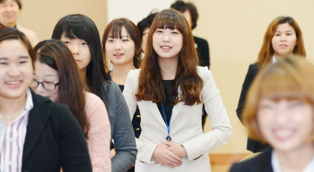30일 여성가족부 주관으로 전주비전대학교에서 열린 취업캠프에서 유아교육과 및 간호과 재학생들이 취업 면접시 필요한 기본매너 및 전략적 자기PR 등 예비취업생이 갖춰야 할 매너교육을 받고 있다.