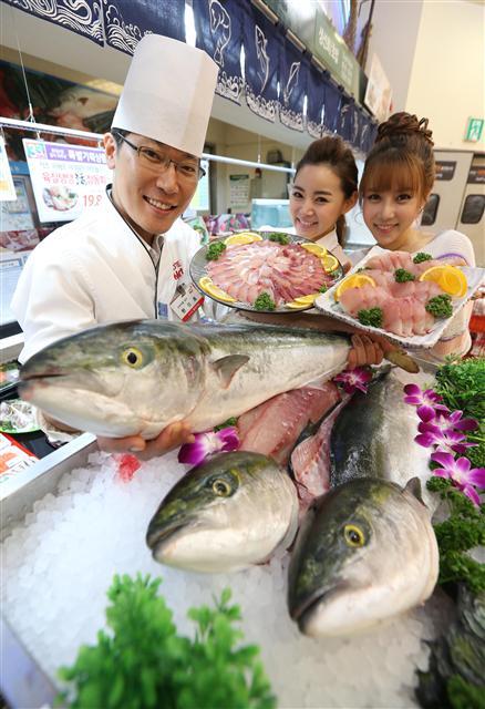 6일롯데마트 서울역점에서 모델들이 겨울철 별미인 방어와 방어회를 선보이고 있다. 롯데마트는 한려수도가 산지인 방어회를 오는 8일부터 시세보다 30% 가량 저렴한 400g 1팩에 1만4500원에 선보인다고 밝혔다.··· 연합뉴스