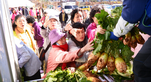 태풍 등의 영향으로 배추·무 가격이 올라 김장 비용이 지난해보다 큰폭으로 오른 가운데 15일 전주 평화동 꽃밭정이노인복지관앞에서 열린 김장채소 수급안정을 위한 임시 김장시장에 시민들이 트럭에서 내리지도 않은 김장채소를 먼저 사려고 손을 내밀고 있다. ·
