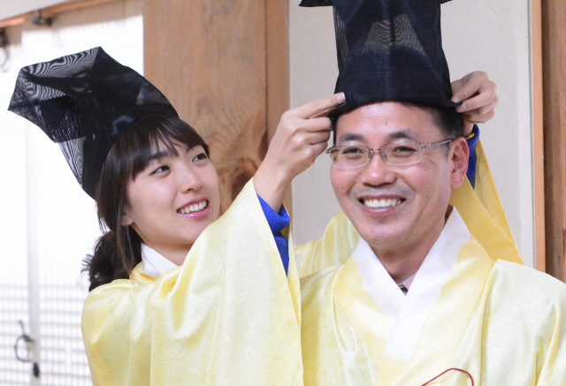 5일 전주 한옥마을 전통문화연수원에서 열린 전국 슬로시티 지자체 공무원 워크숍에서 참석자들이 도포와 유건을 쓰고 전통문화체험을 하고 있다.