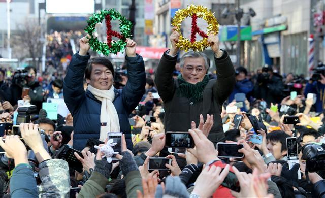 민주통합당 문재인 대선후보와 안철수 전 후보가 9일 경기도 군포시 산본역 앞에서 열린 집중유세에서 유권자에게 투표참여를 촉구하고 있다. ··· 연합뉴스