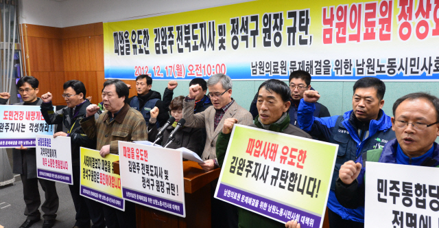 17일 전북도의회 브리핑룸에서 남원의료원 문제해결을 위한 남원노동시민사회단체 회원들이 남원의료원 정상화를 요구하며 구호를 외치고 있다. (관련기사 12면)·······