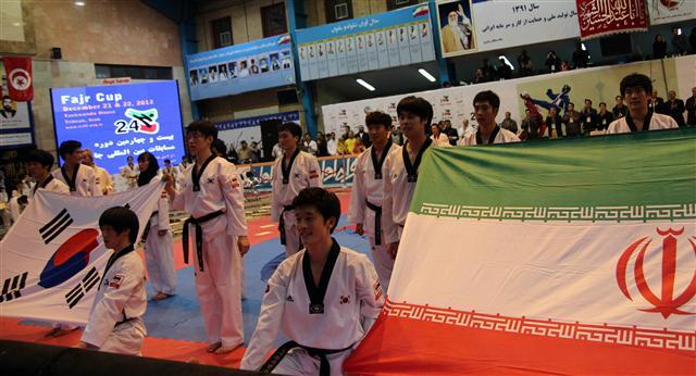 국기원 태권도 시범단이 지난 21일 오후(현지시간) 이란 테헤란 `태권도 하우스'에서 열린 제24회 파즈르컵 국제태권도대회에 앞서 2000여 이란 관중 앞에서 양국의 대형 국기를 앞세우며 공연의 피날레를 장식하고 있다. 이번 이란 순회공연은 한-이란 수교 50주년을 맞아 주이란 한국대사관, 국기원, 이란태권도협회 등이 마련한 것으로 이스파한(23일)과 타브리즈(25일)에서도 각각 펼쳐졌다.